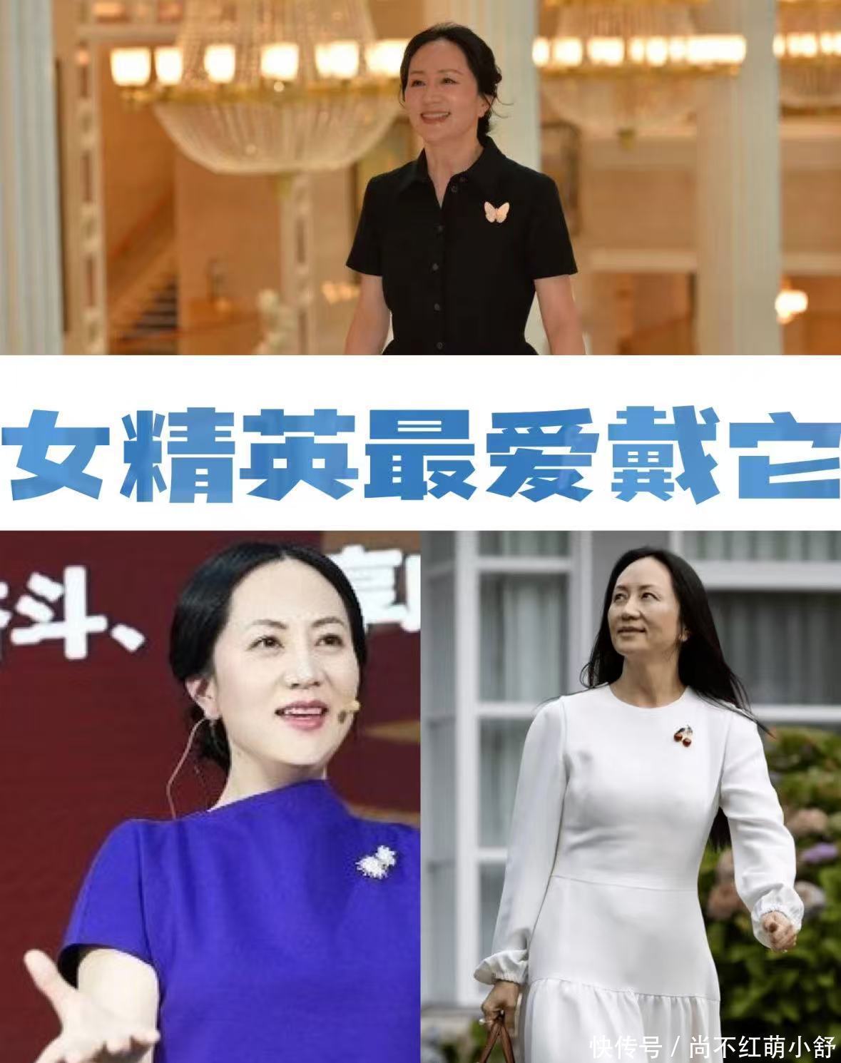 1)胸针: 放弃水钻和夸张的合金饰品。投资一两件胸针、珍珠或品质感强的丝巾饰品。像孟晚舟的胸针就是她的标配,搭配基础款单品,展现出时髦的贵气感足矣。