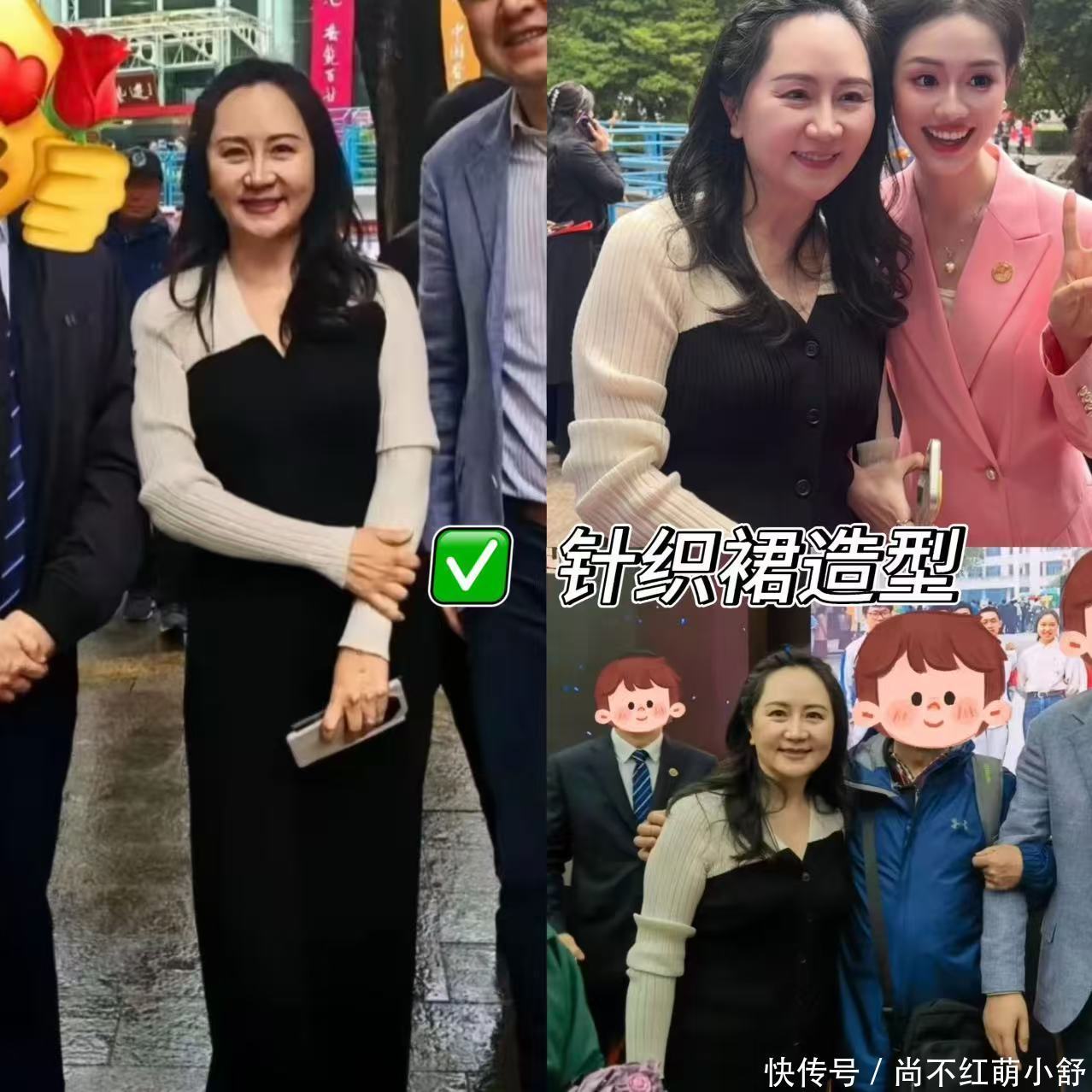 孟晚舟选择一件质感软糯的针织裙,搭配蓬松的波浪卷发,极大提升造型的高级感。记住针织裙不要只穿纯色。可以尝试同色系搭配或者两种进阶色搭配,比如孟晚舟这套米色+黑色的针织衫,上浅+下深的组合,高级感瞬间拉满。