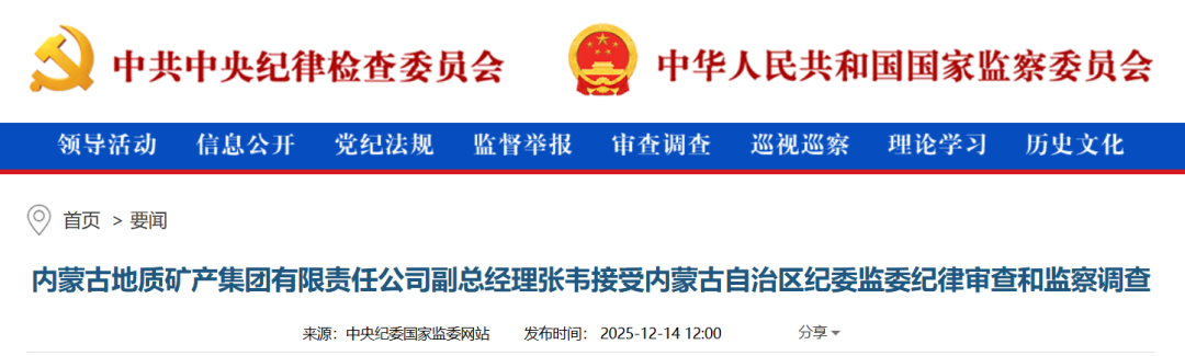 中央纪委国家监委网站12月14日,据内蒙古自治区纪委监委消息:内蒙古地质矿产集团有限责任公司副总经理张韦涉嫌严重违纪违法,目前正接受内蒙古自治区纪委监委纪律审查和监察调查。